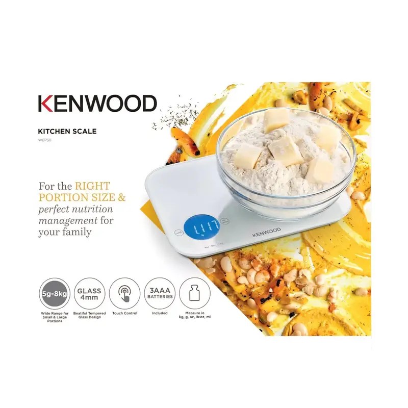 Kenwood WEP50 Digital Kitchen Weighing Scale – 5g to 8kg Capacity, Touch Control, LCD Display, Tempered Glass